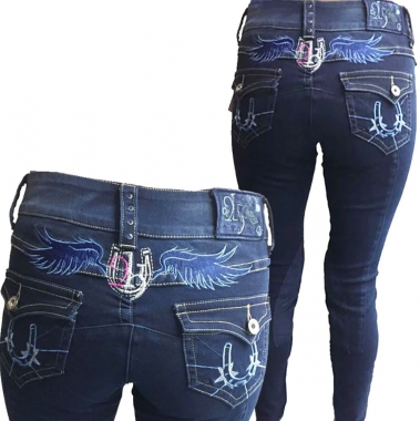 Ladies 2kgrey horse shoes knee patch riding jeans ready for a fresh new take on the classic breech look no further than our riding jean. It all starts with a more flattering cut and hand-distressed, stretchy indigo denim. Traditional five-pocket jean styling is brought to life by brilliant fuchsia stitching, which provides the perfect outline for the heavily embroidered and embellished back pockets.