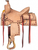 The Boulder Roping Saddle features a scuff-resistant roughout exterior that is stylishly accented with large latigo lacing. The Copper colored slotted conchos bring out the rich color of the latigo strings/lacing. Cutaway skirt along with in-skirt rigging provide optimal close contact feel. Saddle features include rawhide wrapped roper style stirrups, Tough1 Quick Change fender buckles