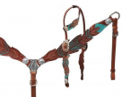 Showman Cut-out, Hand Painted Feather Wither Strap. This strap features Medium oil leather with a 2 1/2" cut-out and tooled feather design with teal hand painted accents. Wither straps keep your breast collar in the perfect position!