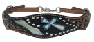 Hand painted browband headstall and breast collar set features double stitched Medium oil leather with Silver and Teal hand painted cross and Metallic Silver inlay. Breast collar features Metallic Silver fringe.