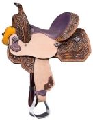 Silver Royal Sweet Pea Youth Saddle. The Sweet Pea collection saddle features Purple and Gold floral print overlay and Purple dot accents. Silver conchos with Iridescent Swarovski crystals and Purple gems accent the set.