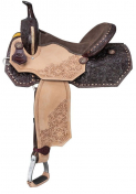 Silver Royal Bisbee Barrel saddle definitely stands out with its dark oil tooled leather contrasting with light fender/jockey. The rawhide buckstitching and braiding add the finishing touches and detail to this beautiful saddle. Features Tough1 Quick Change fender buckle, lightweight aluminum stirrups.