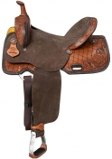 The Weber Barrel Saddle is a great looking saddle which combines two popular colors and unique design elements. The Medium oil skirt, pommel, horn and cantle provide the framework for the chocolate roughout seat, jockey and fender. The hand carved tooling on the skirt combines floral tooling against a backdrop of a diamond shaped lattice pattern. Hand carved diamond pattern can also be found on the hard seat for a subtle yet striking design element. Features include SS in skirt rigging, hoof pick holder, aluminum stirrups and Tough-1 quick change buckles.