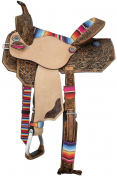 This browband headstall features a trendy, colorful Serape Wool accent on the browband and the cheeks and Turquoise bead conchos. It has double adjustable cheeks, adjustable throat latch, and Chicago screw bit ends for easy changing of bits.